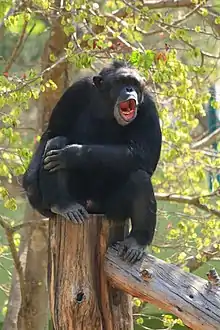 The pant-hoot is a loud, structurally complex vocalization of chimpanzees.[2] The call is generally divided into four distinct, successive phases: introduction, build-up, climax and let-down.[2] This introductory phase begins with soft, breathy, low-frequency 'hoo's' that transition into the build-up phase; a series of increasingly rapid, low-frequency in-and-out pants.[2] Following the build-up phase, the call quickly builds into the climax, consisting of loud, high-frequency screams that eventually slow into the let-down phase, similar in structure to the build-up, but with decreasing amplitude and pace until the call is complete.[2]