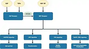 - 1 2 Choueiri TK, Vaishampayan U, Rosenberg JE, Logan TF, Harzstark AL, Bukowski RM, et al. (January 2013). "Phase II and biomarker study of the dual MET/VEGFR2 inhibitor foretinib in patients with papillary renal cell carcinoma". Journal of Clinical Oncology. 31 (2): 181–6. doi:10.1200/JCO.2012.43.3383. PMC 3532390. PMID 23213094.
