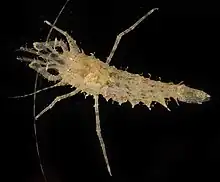 P. echinata is usually brownish in colour, with darker spots. It is most closely related to P. abei.[2] It is found in water depths ranging from sublittoral to 1,380 metres (4,530 ft).[6] It was first described from Puget Sound in the Salish sea, but is found along the North American Pacific coast as far north as Alaska but no farther south than La Jolla, California; and, in Asian waters, in the seas of Japan and Okhotsk as well as the strait of Korea.[2][7][8] The pollexes on their first pereiopods are unusually long, and articulate with their palms.[12] The third pair of pereipods is very fine, and serve a sensory function similar to antennae. They are used to detect prey and probe the shrimp's surroundings.[7]