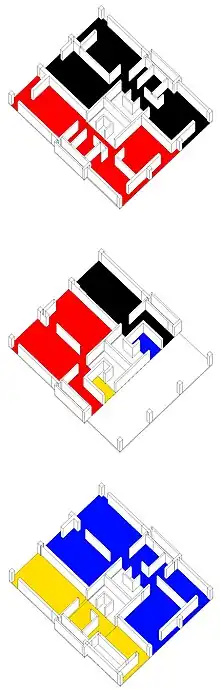The site is steeply sloping (gradient 1 in 10), enabling the designers to maintain a constant roof level though the buildings ranged from four to 13 storeys. There were access roadways 10 feet (3.0 m) on every third storey; these serviced a one-storey flat beneath and a two-storey maisonette on that level and on the level above. The horizontal design repeated itself every three bays, centred on a H-frame that carried the services and stair columns. Each of these units contained a one-bedroom flat, a two-bedroom flat, a two-bedroom maisonette and a three-bedroom maisonette, and stair columns. The kitchens and bathrooms were vertically aligned, allowing simple ducting for services and the Garchey waste disposal system.[24]