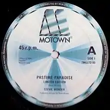"Pastime Paradise" is a song by American musician Stevie Wonder, from the 1976 album Songs in the Key of Life.[1] The song was one of the first to use a synthesizer (the Yamaha GX-1) to sound like a full string section.[3] Built initially from synth tracks rather than from a drummer setting the basic rhythm, the song is augmented with rhythm performances from Ray Maldonado, Bobbye Hall, and Wonder, and a persistent "chinging" bell pattern by Hare Krishna musicians. A gospel choir from West Angeles Church of God and Hare Krishna chanting group culminate in a multicultural finale.[4]