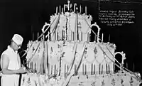 In honour of his 75th birthday, a huge cake (said at the time to be the world’s largest birthday cake) led the Stampede parade and was cut and distributed that evening to the city's underprivileged citizens.[9] Also, he celebrated his birthday by giving a 5 lb roast to every family in which the head of the house was unemployed and a ticket for a meal at any restaurant in the city to the unmarried unemployed. It was during the Depression days, and the gifts were much needed; 2000 Calgary families received the roasts and 4000 single unemployed dined out at his expense.