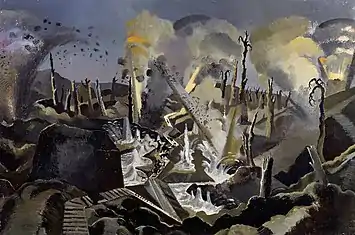 Early in 1918, Nash began working in oils for the first time. The first oil painting he made was The Mule Track in which, amidst explosions from a bombardment, are the tiny figures of soldiers trying to stop their pack animals charging away along another zig-zagging duckboard. Switching to oils allowed Nash to make far greater use of colour and the explosions in The Mule Track contain yellow, orange and mustard shades.[10] The canvas The Ypres Salient at Night captures the disorientation caused by the changes in direction of the defensive trenches at the Front, which Nash would have been familiar with, and which was exacerbated at night by the constant explosion of shells and flares.[15][16]