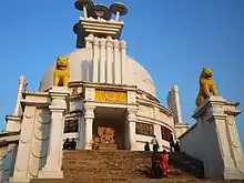 The Rajgir Vishwa Shanti Stupa/World Peace Pagoda (25°00′16″N 85°26′40″E / 25.004553°N 85.444539°E / 25.004553; 85.444539 (Rajgir Peace Pagoda)) was completed in 1969 at Rajgir hills near Rajgir, near the Vulture's Peak where the Buddha is believed to have preached the Lotus Sutra.[3] The dedication coincided with the 100th anniversary of the birth of Mahatma Gandhi. The site also includes a Nipponzan Myohoji temple.[4]