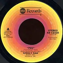"Peg" is a song by the American rock group Steely Dan, first released on the band's 1977 album Aja. The track was released as a single in 1977 and reached number 11 on the US Billboard chart in 1978 and number eight on the Cash Box chart.[4] With a chart run of 19 weeks, "Peg" is tied with "Rikki Don't Lose That Number" and "Hey Nineteen" for being Steely Dan's longest-running chart hit. In Canada, "Peg" spent three weeks at number seven in March 1978.[5]