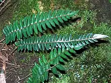 The fronds are usually 20 to 50 cm long. Each frond has between 25 and 65 leaflets. These pinnae (fern leaflets) have a short stalk or no stalk, oblong to narrow-oblong in shape. Each pinna is 25 mm long and 2.5 to 7 cm wide. The fronds are dark green, paler below. The sori are about 1 mm wide.