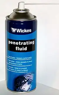 Penetrating oil, also known as penetrating fluid, is a low-viscosity oil. It can be used to free rusted mechanical parts (such as nuts and bolts) so that they can be removed, because it can penetrate into the narrow space between the threads of two parts. It can also be used as a cleaner; however, it should not be used as a general-purpose lubricant or a corrosion stopper. Using penetrating fluids as general-purpose lubricants is not advisable, because such oils are relatively volatile. As a result, much of the penetrating oil will evaporate in a short amount of time, leaving little residual lubricant. Examples include products such as WD-40.