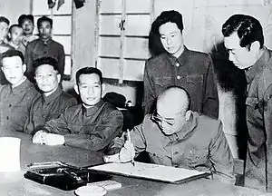 On July 27, 1953, Peng personally signed the armistice agreement in Panmunjom. At a mass rally in Pyongyang on July 31, Kim Il Sung awarded Peng his second North Korean "National Flag" Order of Merit, First Class (the first had been awarded to Peng in 1951) and awarded Peng the title of "Hero of the Korean Democratic People's Republic." Peng also received a hero's welcome in Tiananmen Square on August 11.[62] Chinese troops remained in North Korea until 1958.[63]