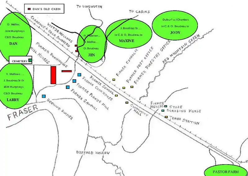 Contents are a composite of source data.[78][79] Clarence & Olga Boudreau's five properties are now owned by their children. . Larry has the former 108-acre Victor Mellows farm on the river. Immediately north, Dan has the former 153-acre Ole Mellos square property, of which 25 acres is north of the track. Jen has the former N. Pedersen 43-acre pentagonal farm, where her parents lived. Maxine has the farm owned by her grandparents. Jody (daughter of Diane Louise) has the former J. Dufour farm. The latter two are each 160 acres and square, with southern boundaries at the same latitude as Dan's one.[3][80] In addition to the mill accommodation, forestry, CNR and private dwellings existed.[81]