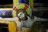 In December 2021, the Crucifix was placed on the iconostasis after structure was made in August. The cross and the two side mosaics (ro:Molenii) were made between 2018 and 2021 by the iconographer Daniel Codrescu, along with other nine mosaic specialists.[137] The Crucifix with a height of 4.3 meters, rising to 22.3 meters from the floor of the cathedral.[107] In the side-attendant of the Crucifix, are the mosaics of the Theotokos and Saint John the Apostle, and together with the Crucifix have 10 square meters of mosaic. On the face behind the Crucifix, is a pelican with chicks, and at the bottom is a quote from the second ode of the Lord's Lamentations at the Burial (ro:Prohod): Like a pelican, You hurt yourself into your rib, O Saviour!; You gave your life, for your sons who died, spreading living springs over them. The image of the mother pelican feeding her chicks with his blood, is rooted in an ancient legends which preceded Christianity. The pelican is a symbol of the Passion of Jesus for Christianity and the Eucharist in the East and in the West.[138][139] On the back of the mosaic Theotokos, writes: upon Thy right hand did stand the queen, embellished in a golden vestment and too beautify! (gr-Ps:44; en-Ps:45); and on the back of the mosaic John the Apostle, writes: thine Own of thine Own, we offer unto Thee on behalf of all and for all (Anaphora Liturgy-Byzantine Rite). The sides of the cross are decorated with a golden interlace ornament braided on a red background. The interlace recalls the archaic motif of the braided rope as a symbol of eternal life. The red decoration signifies the blood sacrificed on the cross and the royal power of the Lord. Among the sources of inspiration are the crucifix paintings from Studenica Monastery (1208), Moldovița Monastery (1532), and the crucifixes of Cimabue and Giotto.[140]