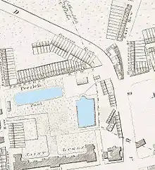 In 1743 the pond was purchased by William Kemp, a jeweller, who developed it by enclosing it in stone edging and adding marble steps and a gravel bottom. He built a separate pond for fishing and renamed the site the more enticing Peerless Pool. The grounds were screened by trees and the pool was used as an ice rink in winter. Kemp imposed an annual admission charge of £1 10s. (or 1s. for day visitors).[1] The pool was 170 ft long x 108 ft wide and from 3–5 feet deep. It was London's first outdoor public swimming pool.