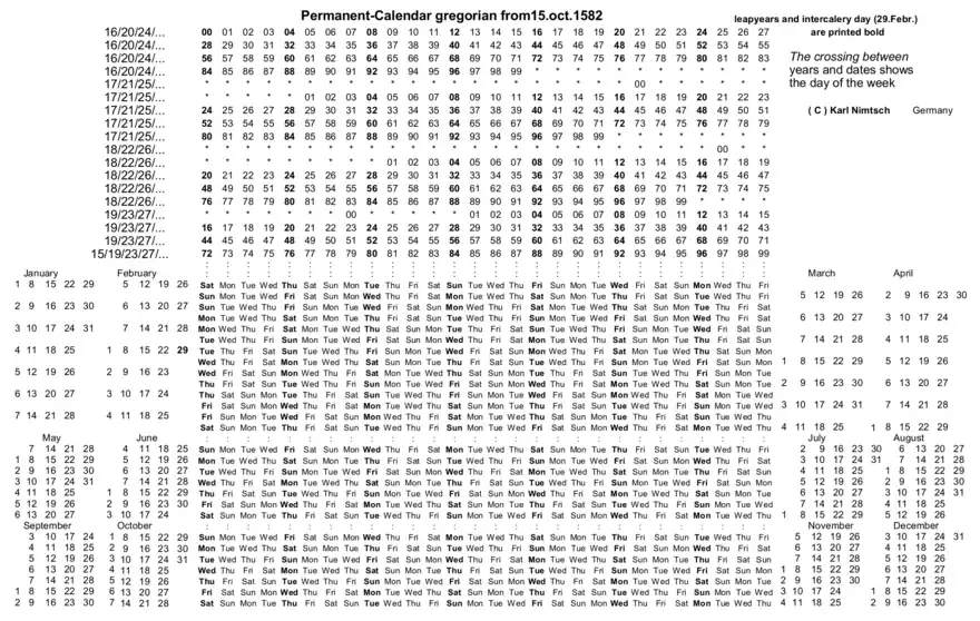 This calendar is used to determine on what day does a date fall on. It is applicable for the Julian dates until 1999 and Gregorian dates until the year 2399.