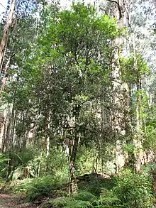 Tree geebung occurs in high rainfall mountain ash forest to the north-east of Melbourne at altitudes of 450–1,200 m (1,480–3,940 ft). It is listed as "vulnerable" on the Department of Sustainability and Environment's Advisory List of Rare Or Threatened Plants In Victoria.[7] However, within its limited range it is relatively common, and is able to colonise disturbed areas. About 40% of its habitat lies within the Yarra Ranges National Park, while the remaining 60% occurs on public land utilised for logging.[4]