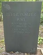 Porter died on 23 April 2010, aged 81, after suffering from liver cancer for a year.[6] After news of Porter's death in 2010, the Australian Book Review (ABR) announced that, in his honour, it would rename its ABR Poetry Prize as the Peter Porter Poetry Prize.[7] He was buried on the eastern side of Highgate Cemetery.