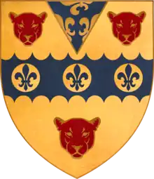 - Samuel Sainthill (1626-1708), 2nd[4] and eldest surviving son and heir, who recovered much of his father's property sequestrated during the Civil War.[2] In 1679 he erected the surviving monument to his father in Bradninch Church. He died unmarried and had been expected to appoint as his heir his nearest male relative John Sainthill (1676-1730[4]) of Topsham, Devon, the son of his third cousin. However, "having given some offence, the old squire made a more natural choice"[20] and left his estates instead to his nephew, Edward Yarde (1637-1732), of Tresbeare (son of his sister Dorothea Sainthill), who adopted the surname of Sainthill by Act of Parliament, and being a bachelor of 71, married, and died in 1732, aged 95, leaving one son Edward Sainthill, whose daughter and heiress Elizabeth Sainthill (1764-1843) married Rear Admiral Thomas Pearse (1759-1830),[21] whose mural monument survives in Bradninch Church, and left a son George Pearse (1799-1861) of Bradninch House, the representative of the Sainthills of Bradninch and Yardes of Treasbeare.[20] George Pearse was a solicitor and married Raby Hewitt, daughter of William Kellett Hewitt of St Elizabeth, Jamaica, a slave-owner.[22] He founded the "George Pearse's Educational Foundation",[23] still extant in the parish of Bradninch today, making grants to (amongst others) "Organisations, people of a particular ethnic or racial origin".[24]