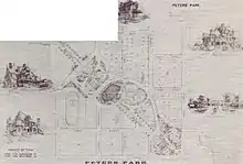 At one point the project was described as encompassing 216 acres (87 ha), out of which 142 would be lots, 48 would streets and 26 acres (11 ha), parks.[1] (Other sources describe the project as 180 acres (73 ha). Peters Park would be accessible via the Peachtree or Marietta Street horsecar lines of the Atlanta Street Railway Company. Lots were improved by the land development company, a novelty for Atlanta at the time. By May 1885, $50,000 had been spent improving the neighborhood in anticipation of lot sales.