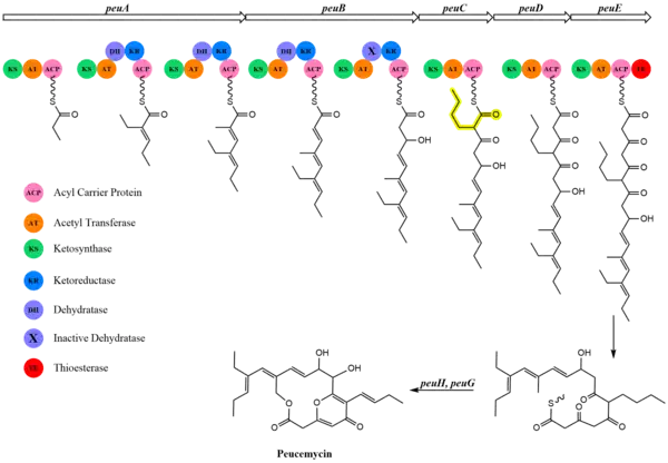Peucemycin is synthesized through a type 1 polyketide synthase with 8 proposed modules from 5 PKS-related genes (peuA-peuE).[2] The type 1 PKS pathway used for biosynthesis is shown in Figure 1. The first gene, peuA, encodes for an initiation module and two elongation modules. The structure of the ketosynthase enzyme in the initiation module has a mutation of a cysteine residue to a glutamine residue that allows for decarboxylation of the starting material without condensation.[3] The next gene, peuB, encodes for modules 3 and 4. Sequencing data of Module 4 indicates presence of a dehydratase enzyme, but amino acid mutations leave this enzyme inactivated, meaning a singular hydroxyl group at carbon 9 is generated. Module 5 is encoded by peuC, and an additional gene, peuI, is proposed to introduce the butyl malonyl-CoA in this module. Modules 6 and 7 are encoded by peuD and peuE respectively. The forming polyketide chain is hydroxylated with cytochrome P450 enzymes, peuH and peuG, and the terminal thioesterase domain in Module 7 catalyzes the product release and macrocycle formation to form peucemycin.