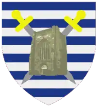 Barry of twelve Azure and Argent two swords in saltire points in base Proper hilts pommels and quillons Or surmounted by a representation of the tower of Beauchief Abbey Proper.