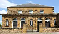 The Doddridge United Reformed Church (formerly the Castle Hill URC) in Doddridge Street, Northampton, was formerly Congregational, Doddridge and Commercial Street URC. It was the scene of the ministry of Doddridge from 1729 to 1751. The church was founded in 1662, built in 1695 and enlarged in 1842. It united with Commercial Street church in 1959 and became a United Reformed Church in 1972. The interior has galleries and box pews and a memorial to Doddridge.[13] The building was Grade II listed by English Heritage in 1952.[14]