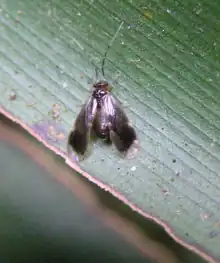 Cuénoud collected Psocoptera (an insect order related to lice) for the best part of the year 1993 in Papua New Guinea, on the traditional grounds of the Biangai and Biaru people, in the Morobe province, as well as in the Baitabag forest, in the Madang province, and took part in a survey of the bird species of the Kuper mountain range.[12] The rich material obtained allowed him to revise the New Guinean endemic genus Novopsocus (Pseudocaeciliidae) and to describe the two new species Novopsocus magnus and Novopsocus caeciliae,[2] by comparison with specimens of the Australian Museum lent by Courtenay Smithers (previous authors had mistaken males of N. magnus for males of the type species Novopsocus stenopterus, whilst N. caeciliae had never been found before). Cuénoud also had a minor part in the Ibisca project ("Investigating the Biodiversity of Soil and Canopy Arthropods"), an ambitious scientific programme led by Bruno Corbara, Maurice Leponce, Hector Barrios and Yves Basset (with the initial support of Edward O. Wilson), that produced new data on the biodiversity of the San Lorenzo rainforest, on the Caribbean coast of the Panama isthmus (in a paper written by the Ibisca team and featured on the cover of the prestigious scientific journal Science,[13] the total count of arthropod species of the forest was extrapolated to be about 25'000). Cuénoud is possibly the only person this far (as of 2019) to have seen (and photographed) a live specimen of the rare insect species Oronoqua ibisca (Issidae), discovered during the field-sampling phase of the project and known otherwise from dead specimens.[14]