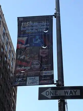 ![]() From Manila to Manhattan: Philippine Independence Day Parade 2013 banner, on Madison Avenue in New York City | |