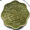 A second eight-pointed scallop edge coin featuring Aquino was minted from 1975 to 1983. The name of the Republic was moved to the obverse, and Aquino now faced the left. On the reverse read the inscription 'Ang Bagong Lipunan'. The issues from 1979 to 1982 featured a mintmark underneath the five centavo.