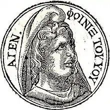 Phoenix was believed to have fathered a number of children with different women. By Cassiopeia, Phoenix had a daughter, Carme,[20] and three sons:[21] Cilix,[22] Phineus,[23][24][25] and Doryclus, as well as a stepson Atymnius, whose natural father was Zeus;[26] by Alphesiboea, he had Adonis.[3][27][28] Phoenix was also credited as the father of Cepheus, king of Ethiopia, whose wife was another Cassiopeia.[29]
