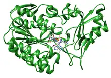 ![]() Structure of phosphonoacetate hydrolase. PDB entry 1e16. Zinc ions and phosphonoformate are shown in the active site. | |||||||||