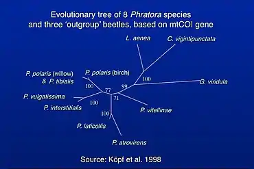 - 1 2 3 4 5 6 Köpf, A.; Rank, N. E.; Roininen, H.; Julkunen-Tiitto, R.; Pasteels, J. M.; Tahvanainen, J. (1998). "The evolution of host-plant use and sequestration in the leaf beetle genus Phratora (Coleoptera: Chrysomelidae)". Evolution. 52 (2): 517–528. doi:10.1111/j.1558-5646.1998.tb01651.x. PMID 28568343. S2CID 24641299.
