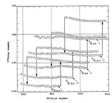 To invoke dynamic similarity,[4] the characteristic speed in a study was chosen to be the average speed U of the jet at the orifice and the characteristic length was chosen to be the orifice diameter δ. Tests were made at five spacing distances h/δ from the orifice. Two scaling laws were used: the Strouhal number was graphed as a function of the Reynolds number. The results are shown in the figure on the right.