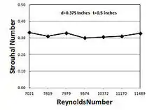 For many applications, the first equation below is often used. A review of the literature[23] produced the figure on the right for the Strouhal number. At low Reynolds numbers the Strouhal number rises as inertial effects begin to dominate and then decays slightly at higher numbers. The second equation below is a best fit for the data for 1000 < Re < 100000.