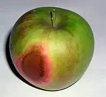 Hail can cause damage to soft skinned fruits, and may also allow brown rot or other fungi to penetrate the plant. Brown spot markings or lines on one side of a mature apple are indicative of a spring hailstorm.