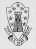 The membership badge was a black enamel shield surrounded by jewels. The Greek letters, in gold, were inscribed vertically on the shield. A jewel was between the enamel and the surrounding jewel photo.[8]