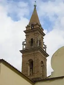 A Baroque baldachin with polychrome marbles was added by Giovanni Battista Caccini and Gherardo Silvani over the high altar, in 1601. The church remained undecorated until the 18th century, when the walls were plastered. The inner façade is by Salvi d'Andrea, and has still the original glass window with the Pentecost designed by Pietro Perugino. The bell tower (1503) was designed by Baccio d'Agnolo.