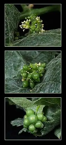 Fruit can be obtained all year round from the Pixie. The Pixie's fruit is a black fruited grape with seeds in it. Cluster length usually maxes out at 10 cm in length and the vines that are not regularly thinned tend to grow a lot of fruit and in turn slow growth and reduce the number of flowers produced. Seeds can be obtained and there have been known results of seedlings growing and showing flowers. However, due to a reduced sensitivity to gibberellins a Gibberellic Acid treatment is necessary when undergoing seed germination.
