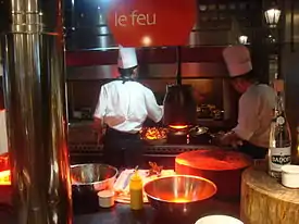 In restaurants, flattop grills are sometimes used for display, or “front-of-house” cooking,[3] where diners can see, hear and smell the food being cooked in front of them. Unlike butane burners or induction hobs which require additional equipment, the flattop grill can be used as a standalone cooking platform. Display cooking is a notable trend in commercial foodservice, where open kitchens are becoming part of the dining experience, and watching a meal being prepared live-action has become entertainment.