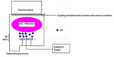In a conventional immersion type of PIII system, also called as the diode type configuration,[2] the wafer is kept at a negative potential since the positively charged ions of the electropositive plasma are the ones who get extracted and implanted. The wafer sample to be treated is placed on a sample holder in a vacuum chamber. The sample holder is connected to a high voltage power supply and is electrically insulated from the chamber wall. By means of pumping and gas feed systems, an atmosphere of a working gas at a suitable pressure is created.[3]