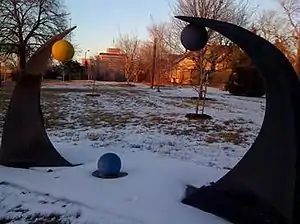 The painted-metal sculpture consists of two large, curvilinear forms facing each other.[2] One curved form has a yellow ball and the other has a purple ball attached near their pointed extremities. A blue ball rests between the two curves on a metal platform that encompasses both arcs.