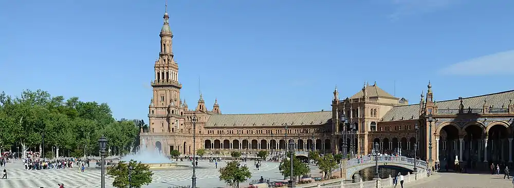 The Plaza de España ("Spain Square", in English) is a plaza in the Parque de María Luisa (Maria Luisa Park), in Seville, Spain. It was built in 1928 for the Ibero-American Exposition of 1929. It is a landmark example of Regionalism Architecture, mixing elements of the Baroque Revival, Renaissance Revival and Moorish Revival (Neo-Mudéjar) styles of Spanish architecture.[1]