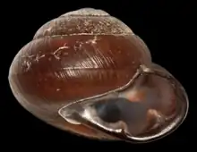 | Apertural view of a shell of Pleurodonte nigrescens. The height of the shell is 11.1 mm. | |