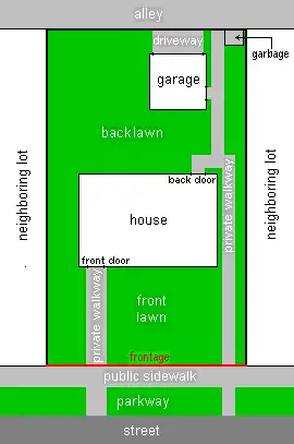 Diagram of an example house plot as seen from above, showing front and back lawns, positions of structures on the plot, and immediate surroundings. The plot boundaries are outlined in black except for the frontage, which is shown in red. In this example, the immediate surroundings include a pavement, parking area, and section of the road out in front and a section of an alley at the back. Plot structures include a house, private walkways, and at the back - a detached garage with a drive access to the alley and a small area for refuse.