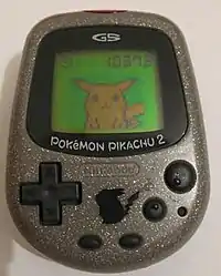 The second release, Pokémon Pikachu 2 GS, is available in clear and silver casing with a color display featuring more animations.[8] It features an infrared port for interacting with Pokémon Gold, Silver, and Crystal via the Mystery Gift option, which utilizes the Game Boy Color's built-in infrared communication port. This allows players to trade watts for items in the Game Boy games. Although there is a limitation on how much the Mystery Gift mode can be used between Game Boy cartridges, Pokémon Pikachu's only limit is that of available watts (and it is region locked). Watts can also be sent to other Pokémon Pikachu 2 units.[9]