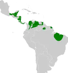It is found in Belize, Brazil, Colombia, Costa Rica, French Guiana, Guatemala, Guyana, Honduras, Mexico, Nicaragua, Panama, and Venezuela. Its natural habitats are subtropical or tropical dry forest, subtropical or tropical moist lowland forest, and heavily degraded former forest.