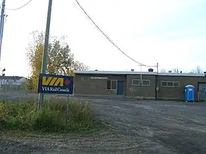 The disused station building viewed from the corner of 64e Avenue and Prince Albert Street, a portable toilet is visible on the right