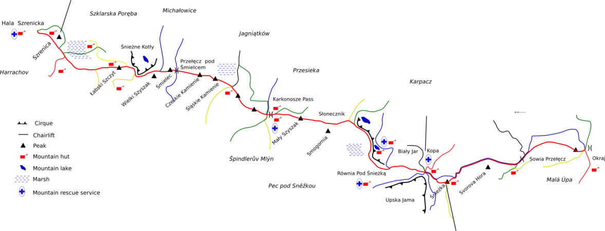 The path is accessible by chair lifts from Szklarska Poręba, Karpacz and Špindlerův Mlýn. It is open the whole year, although some parts as well as linking routes may be closed in winter due to avalanches. Along the trail there are over 10 junctions with other trails, leading to towns, bus and railway stations in both countries respectively. Mountain huts are available on the trail or in the vicinity, mostly with refreshments and some offering catering for organised groups. The route is secured with fences along abysses (Śnieżne Kotły, Mały Staw and Wielki Staw), other climbing aids, mostly chains, are available in the most difficult parts. The route falls under the Karkonosze National Park ordinance, according to which, among others, hiking out of the marked trails, shortcuts and rough camping are forbidden[19] and are subjects to fines. The path is clearly and visibly marked, although Polish signs show distances in hours, Czech ones - in kilometres.