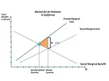 In economics, an externality occurs when the producer does not have to pay its full cost, and when it affects another party either positively or negatively. If the cost to society is greater than the cost the consumer is paying for it, then the externality is negative because it imposes this extra cost on society, which can lead to market inefficiencies. Solving the problem of negative externalities can be costly on its own, as it is often difficult to assign responsibility. Typically, the party who owns the property rights to the polluted area is responsible for paying the cost, but alternative strategies include taxing the producer or collecting payments from a determined group of individuals.[24] California suffers specifically from negative production externalities, which is when a firm's production reduces the well-being of others who are not compensated by the firm.[25]