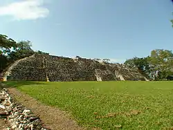 There are texts at Pomona referring to dates as early as 297 CE, but little more is known from this time period.[1] In 659 CE, Palenque captured six lords in battle. One was said to be from Pipa', a location associated with the site of Pomona. Another Pipa' lord was said to have died in 663.[2] A king of Pomona rose to the throne under the supervision of K'inich Kan Bahlam III of Palenque in 751 CE.[3] In March 792 CE, Piedras Negras attacked Pomona and took prisoners (depicted on Piedras Negras stela 12); the same happened two years later. The defeated king at Pomona was named Kuch' Bahlam.[4]