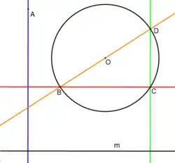 - This red line which passes through the given circle but not its center, will intersect the given circle in two points, B and C.