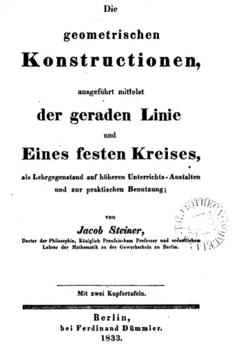 - ↑ Jacob Steiner (1833). Die geometrischen Konstructionen, ausgeführt mittelst der geraden Linie und eines festen Kreises, als Lehrgegenstand auf höheren Unterrichts-Anstalten und zur praktischen Benutzung (in German). Berlin: Ferdinand Dümmler. Retrieved 2 April 2013.