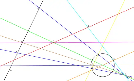 - Choosing a point M arbitrarily on line m, such that it is not on line PO, draw a line PM (in pink).